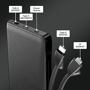 The 10000mAh Built-in Cables Portable Phone Charger is a sleek, wallet-like power bank designed for the modern professional. With built-in Type-C and IP cables, it offers universal compatibility with a variety of smartphones, allowing you to charge up to four devices simultaneously. Its lightweight design makes it easy to carry, while the fast USB-C port ensures quick recharging. Perfect for on-the-go lifestyles, this power bank is a must-have accessory for anyone who values convenience and style.
