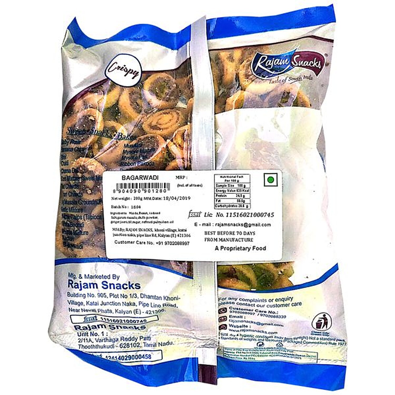 About @import url("https://www.desercart.com/static/froala_style_v2.min.css"); Rajam Snacks Bhakarwadi is a peppery snack. It is made from quality of ingredients. It is extremely delicious and tasty snack. INGREDIENTS @import url("https://www.desercart.com/static/froala_style_v2.min.css"); Gram flour (Besan), Gram dal, Dry coconut, Garlic, Sesame seeds (Til), Turmeric powder, Chilli powder, Garam masala, Spices, Sugar, Salt, Fennel seeds (Saunf), Coriander seeds and Edible oil.