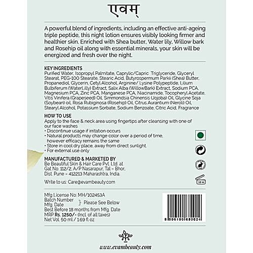 About the Product @import url("https://www.desercart.com/static/froala_style_v2.min.css"); It is a fact that our face undergoes most of its developmental, regrowth, repair and regenerative processes when it is resting in the night time. If only there were a solution that could affect your appearance not only from the inside but also the outside. Well now, there is. a potent blend of natural ingredients, including an active anti-ageing triple peptide, which ensures that your skin feels visibly firmer and nourishes it and makes it healthier from within. Enriched with shea butter, waterlily, willow bark and rosehip oil along with essential minerals, your skin will feel much more energised and refreshed over the course of the night. This non-greasy, non-sticky, specially curated formula is free of all types of parabens, silicones and any other harmful chemicals to give you a younger, rejuvenated skin every morning you wake up.Tip: Following a regular skin care regime can help you achieve flawless skin. For more tips on skin care, visit desercart lifestyle blog, Click Here to visit desercart’s lifestyle blog How to Use @import url("https://www.desercart.com/static/froala_style_v2.min.css"); Step1: Take the required quantity of lotion on the palm of your handsStep2: Spread it across the surface of your handStep3: Gently massage onto clean skin and leave to absorbStep4: Preferably apply the lotion post-showerStep5: Recommended usage, twice every dayStep6: Discontinue use if irritation occursStep7: Natural Products may change colour over a period; however, the efficacy remains the sameStep8: Store in a cool, dry place, away from direct sunlightNote: For external use only Composition @import url("https://www.desercart.com/static/froala_style_v2.min.css"); Peptiskin, Physiogenyl, Simmondsia Chinensis (Jojoba) Oil, Vitamin E, Lilium bulbiferum (waterlily) Extracts, Niacinamide - Vitamin B3, Vitis Vinifera (Grapeseed) Oil, Rosa Rubiginosa (Rosehip) Oil, Willowbark Extracts, Neroli Oil, Shea Butter, Aloe Vera Extracts. Features @import url("https://www.desercart.com/static/froala_style_v2.min.css"); • It rejuvenates and revitalizes the skin• It helps to reduce the appearance of fine line and wrinkles• It provides skin with hydration and energy• Non-greasy, easily absorbed into the skin