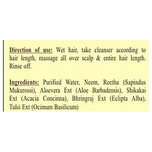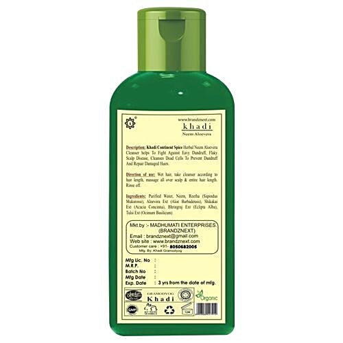About @import url("https://www.desercart.com/static/froala_style_v2.min.css"); Neem Aloe vera Shampoo contains anti-bacterial & anti-fungal properties that help as a natural medicine for good scalp health. Benefits: Enhances hair growth | conditions hair | improves scalp health | helps prevent baldness | promotes hair growth | regrowth of hair. Certifications: a khadi product, Mineral Oil-free, GMP certified, ISO certified, Organic, PH Balanced. of the product in the market. Composition @import url("https://www.desercart.com/static/froala_style_v2.min.css"); Neem Ext, Aloe vera Ext, Tea Tree Ext, Bhringraj Ext, Shikakai Ext, Other Herbal Ext. How to Use @import url("https://www.desercart.com/static/froala_style_v2.min.css"); Wet your hair, take a reasonable amount of shampoo and gently massage all over scalp and hair for about 2 minutes. Wash it off.