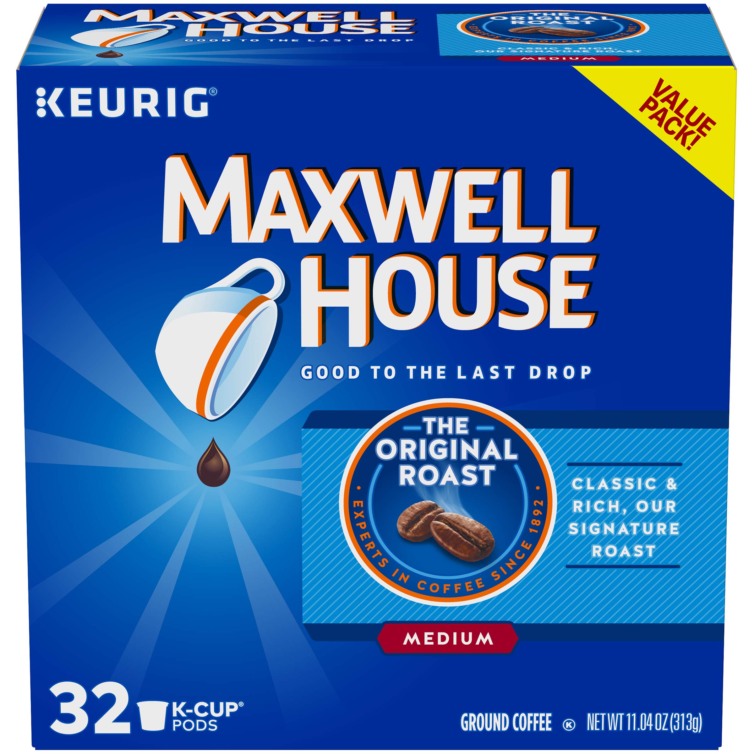 Maxwell House Original Roast Medium Roast K-Cup Coffee Pods offer 32 individually sealed servings of smooth, well-balanced medium roast coffee. Compatible with Keurig 1.0 and 2.0 brewers, this 100% pure, Kosher-certified coffee is proudly roasted in the USA with over 125 years of expertise, ensuring a consistently rich flavor that’s good to the last drop.
