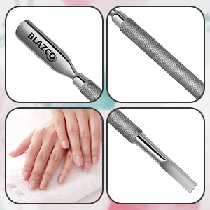 The Blazco Cuticle Pusher and Knife is a professional-grade, dual-sided nail cleaner made from 100% premium stainless steel. Measuring 5-1/2 inches in length, it features sharpened ends for precise cuticle maintenance and an ergonomic non-slip grip for ease of use. Perfect for both home and professional settings, this tool is designed to cater to everyone from teens to salon owners.