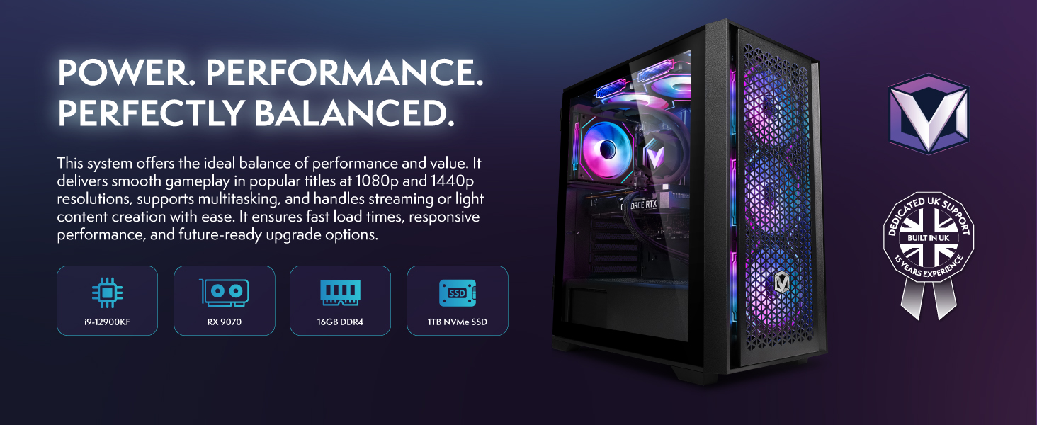 The Vibox VIII-30 Gaming PC Bundle combines a powerhouse Intel Core i9-12900KF 16-core CPU with a cutting-edge AMD Radeon RX 9070 16GB GPU, backed by 16GB DDR4 RAM and a 1TB NVMe SSD. This all-in-one setup includes a 23" 1080p monitor, RGB peripherals, and WiFi connectivity, running Windows 11 for a seamless, high-performance gaming and productivity experience.