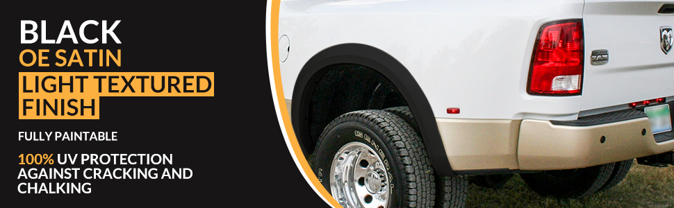 This set of four factory/OE design fender flares fits all 2010-2018 Dodge Ram 2500 and 3500 models (excluding 1500). Made from impact-resistant ABS plastic with a satin micro-textured black finish, these paintable flares offer UV protection and heat/cold resistance. Installation is straightforward with included hardware and no drilling required, backed by a 24-month warranty for durability and peace of mind.