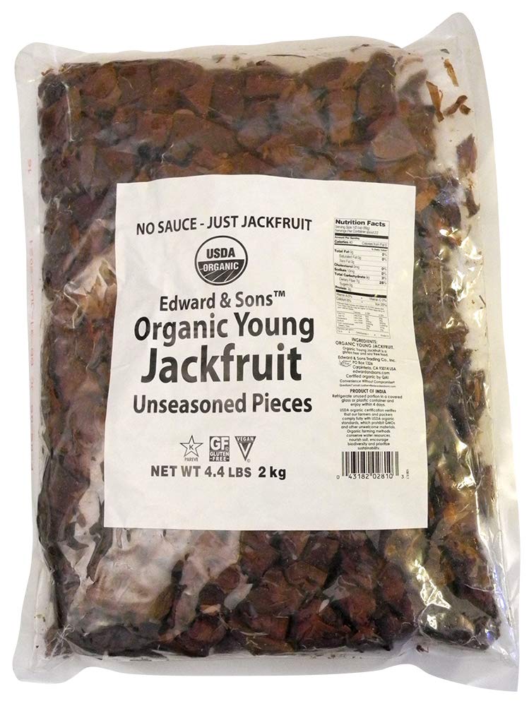 Edward & Sons Organic Young Jackfruit offers a 4.4-pound USDA Organic, sustainably farmed, and Non-GMO certified plant-based meat alternative. Its mild flavor and flaky texture make it an ideal vegan substitute for chicken or pork in a variety of recipes, catering to vegan, gluten-free, keto, paleo, and kosher diets while supporting ethical and healthy eating habits.
