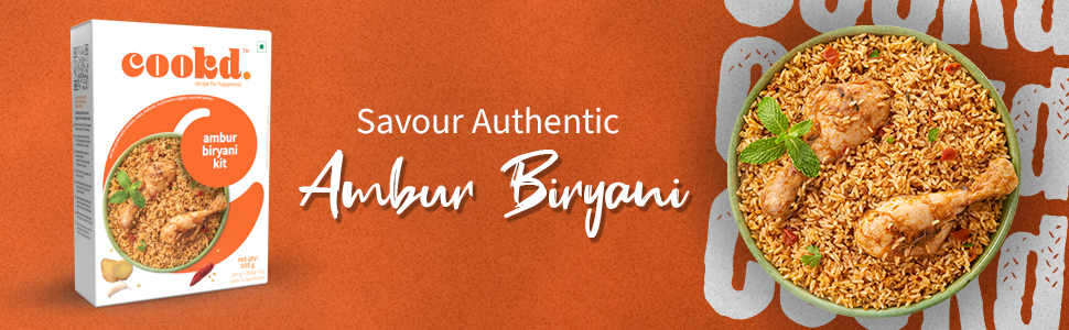 Cookd Ambur Biryani Kit offers a premium, ready-to-cook biryani experience featuring 250g of fragrant Seeraga Samba rice, 250g of chef-crafted Ambur Biryani paste, and seasoning oil. Designed for quick 20-minute preparation, it serves three people with authentic Arcot Nawabs flavors, making gourmet Indian cuisine accessible and convenient for busy professionals.