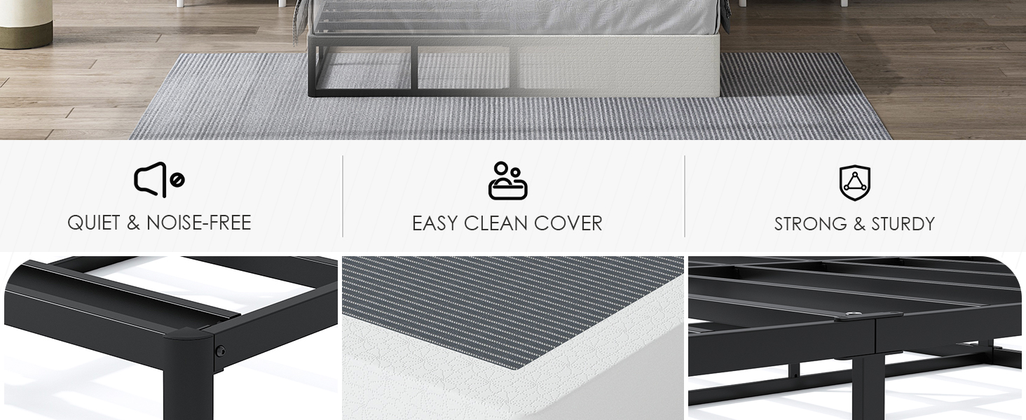 The QEROMY 9 Inch High Profile Queen Box Spring features a reinforced steel frame supporting up to 2000 pounds, a stylish 9-inch height perfect for modern bedrooms, and a premium jacquard cover that prevents mattress slipping and allows easy cleaning. Designed for quiet, squeak-free nights and simple assembly with included tools, it’s the foundation that upgrades both comfort and bedroom aesthetics.
