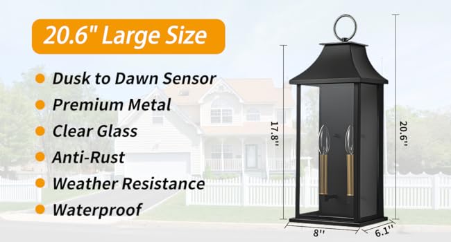 The Lawyettle Dusk to Dawn Outdoor Wall Lantern is a 20.6-inch modern black wall sconce featuring a highly sensitive dusk to dawn sensor that automatically activates lighting at night and shuts off by day. Crafted from rust-resistant aluminum and glass, it offers durable waterproof performance for all weather conditions. Compatible with two E12 bulbs up to 40W, this fixture delivers 900 lumens of bright, energy-efficient illumination ideal for porches, patios, garages, and more. Easy to install with included hardware, it combines style, convenience, and smart energy savings in one sleek package.