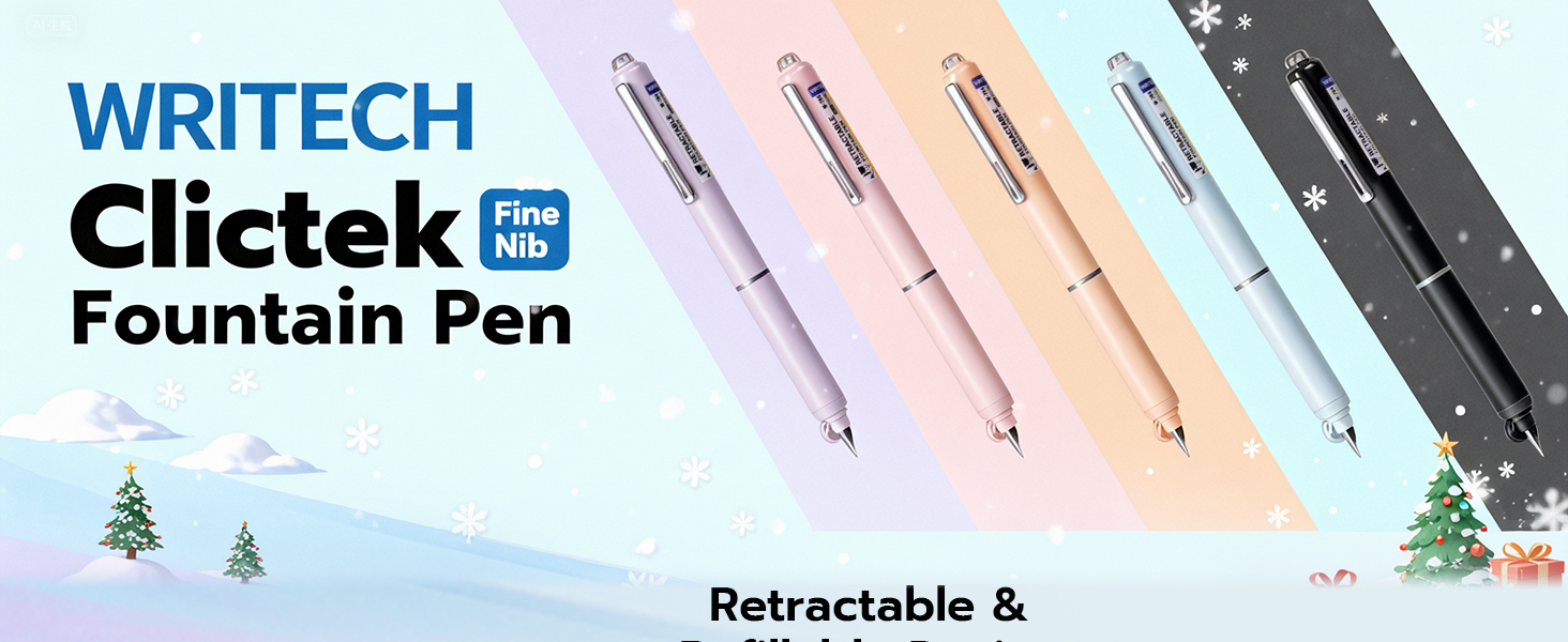 The WRITECH Fountain Pen features a fine 0.3mm retractable nib with black ink, designed for smooth, precise writing and calligraphy. Its ergonomic grip and airtight sealing cover prevent ink drying and leakage, while the refillable system includes 5 eco-friendly cartridges housed in a compact transparent box for convenient storage and sustainability.