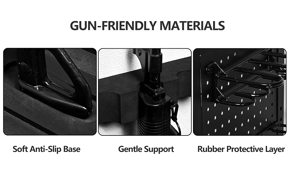This rack does what's advertised to do, but be mindful of how much weight you're leaning on it if it's not against a wall. Due to the nature of the items displayed, you could bolt it down to add a bit of security.Good amount of padding for each slot and there's enough distance between items for charging handles or closed bipod legs not to rub against what's next to them. The peg boards on the sides are handy and convenient. It's a nice rack overall!
