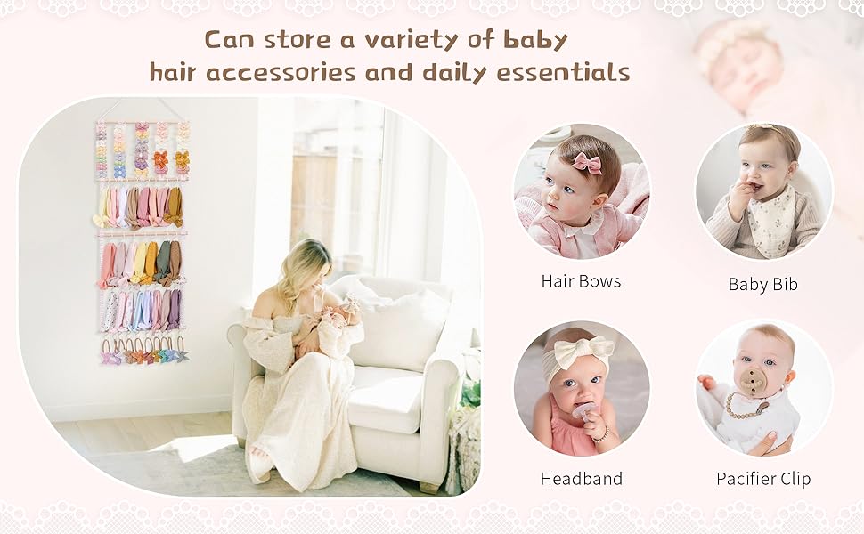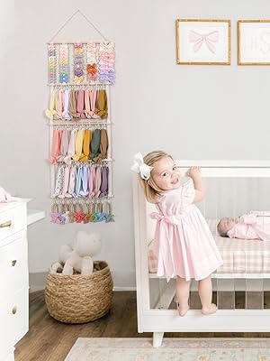 The POVETIRE Headband Holder is a 4-tier wall organizer designed to hold up to 100 hair accessories, featuring a sturdy beech wood frame and durable cotton canvas ribbons. Easy to assemble and space-saving, it keeps toddler rooms neat while doubling as charming decor—ideal for gifting or personal use.